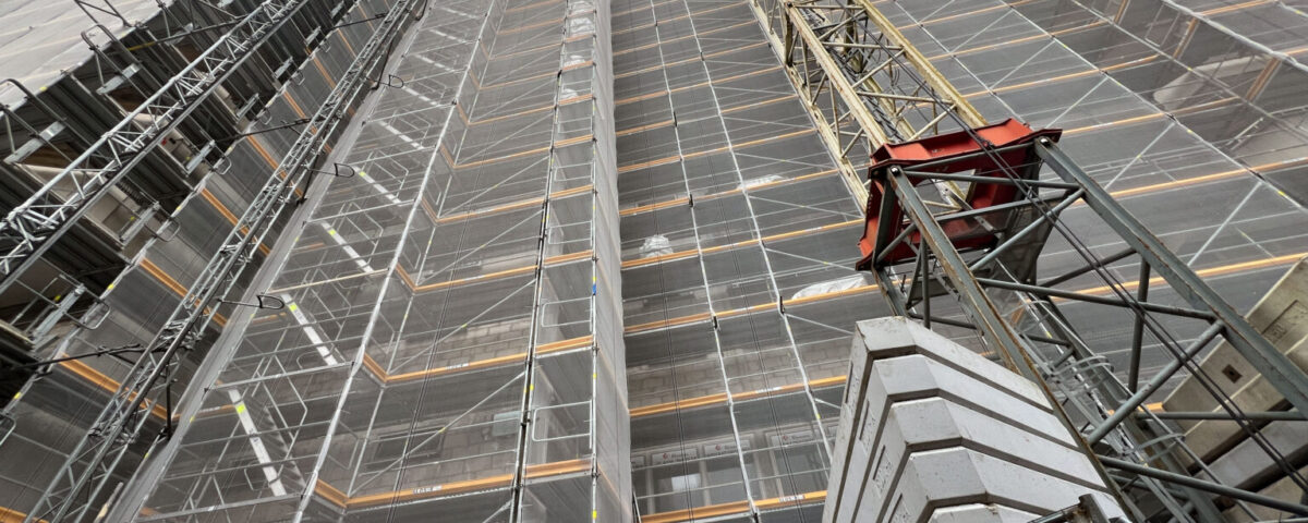 Im Zuge der energetischen Sanierung werden die Fassaden der Gebäude mit neuen Dämmelementen und Fenstern ausgestattet. Eine besondere Herausforderung stellt dabei die Montage des Gerüsts an der Rückseite des Gebäudes dar. Hier ist der Einsatz einer Stahlträgerkonstruktion erforderlich, um das Gerüst zu stützen und die Lasten sicher auf die Decke zu übertragen.