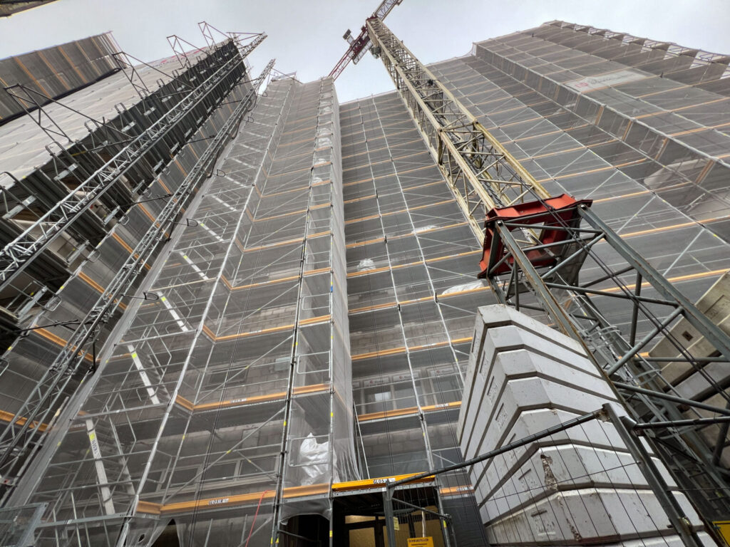 Die Modernisierung des hochgeschossigen Wohnblocks in Köln-Chorweiler begann im Herbst 2024 und die Bauarbeiten schreiten weiter voran.