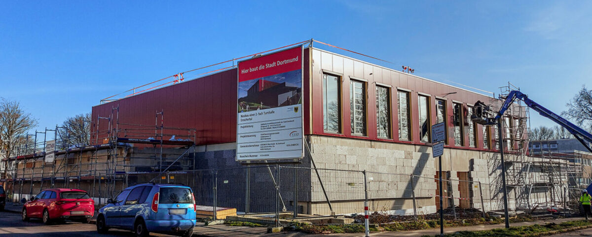 Die Fertigstellung der neuen Zweifach-Turnhalle in Dortmund ist für Herbst 2025 das geplant. Das Projekt liegt gut im Zeitplan und nimmt immer mehr Gestalt an. Die Turnhalle Emschertal wird schon bald ein moderner Ort für Sport und Bewegung sein.